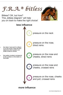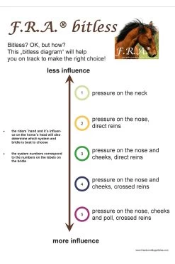 F.R.A. gebisslos System 3: Gebisslose Zäume sind nicht neu! Jahrhundertelang galt ein gebissloses Zaumzeug als selbstverständlich, bevor man überhaupt daran dachte, dem Pferd etwas ins Maul zu legen, legte man einfach etwas darum. Damals reichte ein Seil als Halfter und so entstand das erste gebisslose Zaumzeug. In Kombination mit Stützgewicht, Bein- und Tasthilfe hält die Reiterhand über die Zügel den Kontakt nicht mit dem Maul, sondern mit dem Kopf des Pferdes. Diese Zügelhilfen werden an Nase, Hals und/oder Wangen weitergegeben. Wirkungsprinzip: Druck auf die Nase und Wangen, direkte Zügelführung.