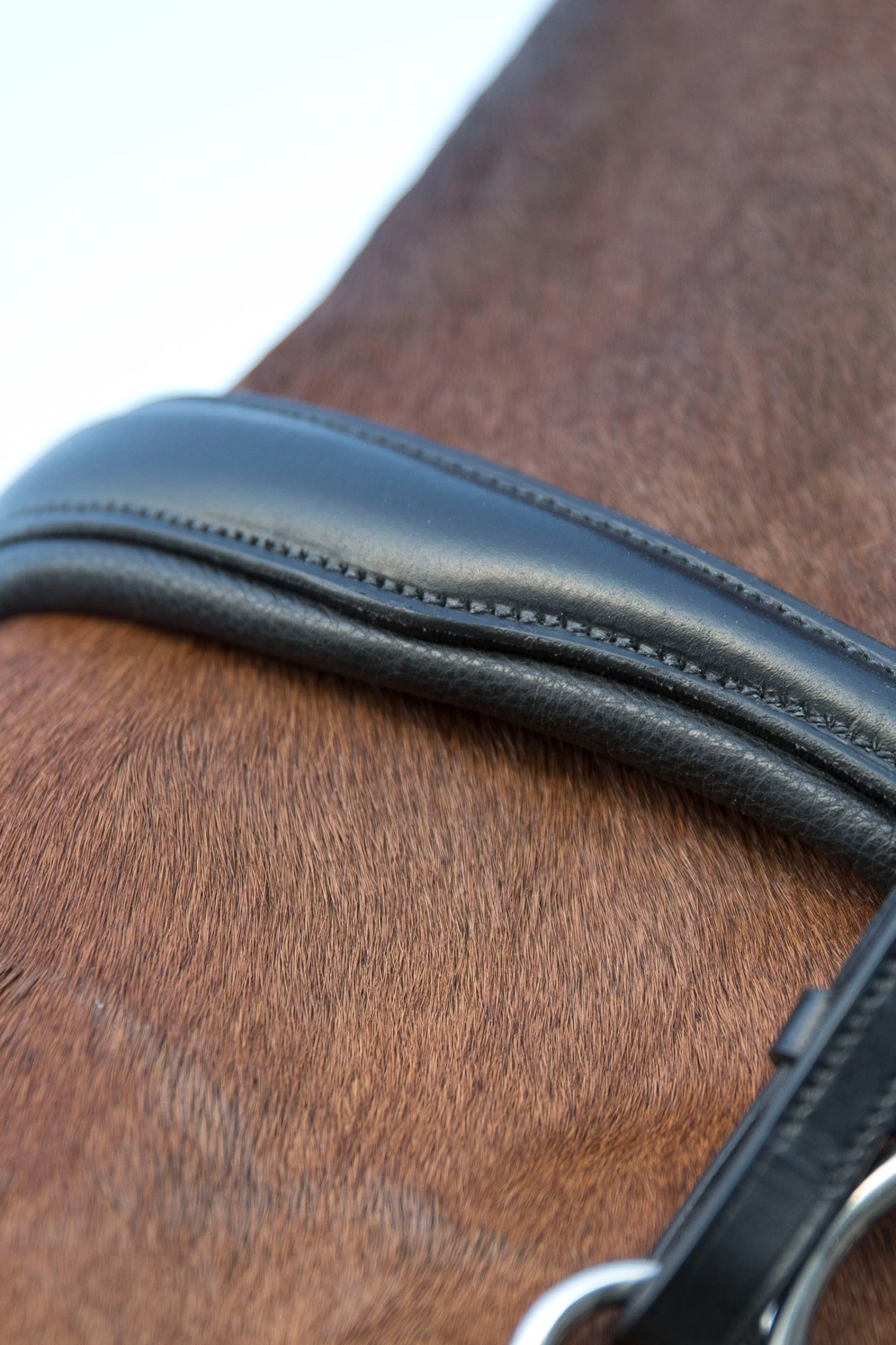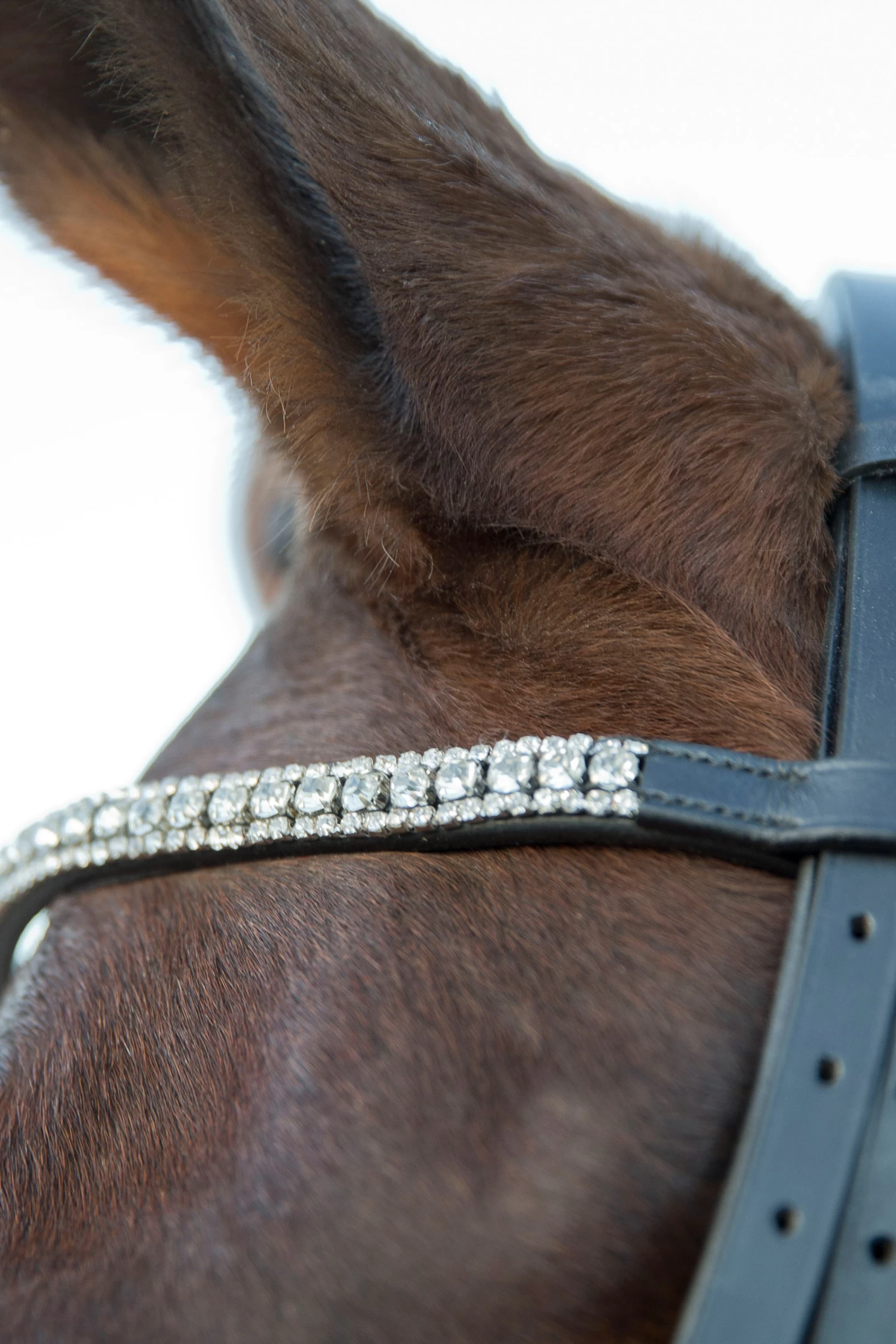 Mit diesem tollen Dressur-Zaumzeug mit gebogenem Stirnriemen und Akzenten aus Kristallen für einen Hauch mehr Eleganz im Viereck, setzen Sie ein Statement. Der breite, ergonomisch geformte Nasenriemen akzentuiert den Kopf. Polsterung an der Nase bietet Komfort und erhält noch den technischen Effekt. Premium Qualitätsleder und Beschläge aus Stahl komplettieren dieses klassische Zaumzeug. Kombinieren Sie die Kandare mit Ihren Lieblings-Zügeln von Horze.
