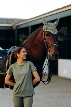 Die Horze Munich Fliegenhaube ist aus zartem Häkelstoff mit elastischen Ohren in wunderschönen Farben gefertigt. Die Vorderseite ist in einer tiefen Bogenform gestaltet und mit einem Bronzestreifen verziert, der ein interessantes Detail ist. Kombiniere diese Fliegenhaube mit unserem Horze Munich Stirnband, der Schabracke und den Gamaschen für ein komplettes Outfit!