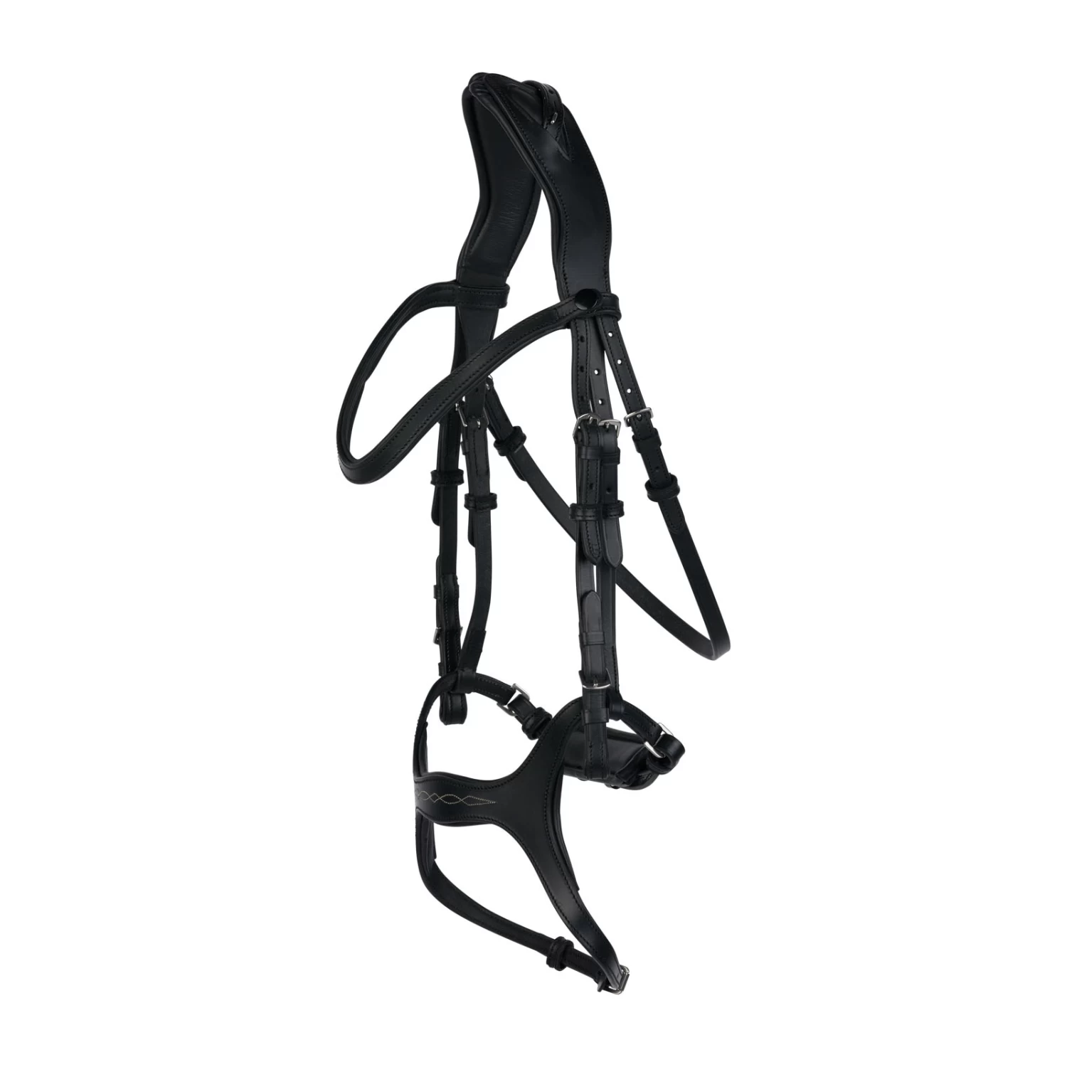 Die Horze Peckham Trense ist mit einer anatomisch geformten Genickpartie ausgestattet, um Reibung zu vermeiden, und zusätzlich an Nase, Genick und Stirnriemen für extra Komfort gepolstert. Das glatte Leder liegt weich auf. Der U-förmige Stirnriemen kann durch Druckknöpfe leicht ausgetauscht werden, und die detaillierte Bestickung auf der Nase ist ein elegantes Detail. Metallbeschläge passen gut zu dem schwarzen oder braunen Leder.