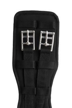 Weicher, geformter Neopren-Dressursattelgurt mit Elastik an einem Ende. Für mehr Komfort reicht das Neopren über die Rollschnallen hinaus, um Scheuerstellen zu vermeiden. Kreuzendes Nylonband für optimale Stabilität und Druckverteilung. Gurtschlaufen halten die Gurtstrupfen an ihrem Platz. Gummi-Logo-Abzeichen in der Mitte.