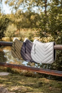 Unsere Horze Victoria Vielseitigkeitsschabracke besteht aus weichem Material mit schnell trocknendem Futter, das jegliche Feuchtigkeit ableitet. Die pfeilförmige Steppung verleiht ihr ein dynamischen Design. Kuscheliges Kunstfell am Widerrist sorgt für Komfort. Hübsche Flechtungen an den Rändern geben ihr einen besonderen Look, und das Logoband entlang der Wirbelsäule bringt einen sportlichen Touch. Auch als Dressurversion erhältlich. Kombiniere sie mit unserer Horze Victoria Fliegenhaube (#22940) für den kompletten Look!