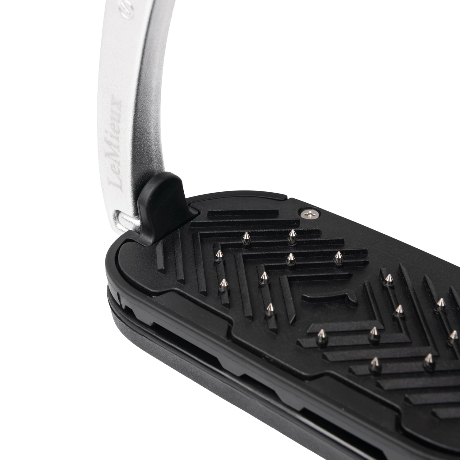 Ein integrierter Sicherheitsarm verfügt über ein zweistufiges Auslösesystem, das ein ungewolltes Öffnen verhindert. Der federbelastete Sicherheitsarm rastet in der Basis des Hauptrahmens ein, so dass bei hoher Belastung beispielsweise nach einem Sprung das Gewicht des Reiters gleichmäßig auf den Steigbügel verteilt wird. Wenn Druck auf den Steigbügelarm ausgeübt wird, z. B. bei einem Sturz, löst sich der Arm, so dass sich der Fuß nicht im Steigbügel verfangen kann. Die Auslösekraft des Steigbügelarms beträgt im Test 36N (entspricht 3,62kg), d.h. genug Widerstand, um ein versehentliches Öffnen zu verhindern, aber ein sicheres Auslösen im Falle eines Sturzes des Reiters zu gewährleisten.