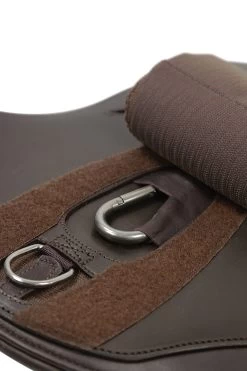 Mehr Bewegungsfreiheit dank optimaler Druckverteilung: Die innovative „Comfort Zone“ bei dem Stollenschutzgurt Oklahoma von Schockemöhle Sports setzt dafür neue Maßstäbe. Anatomisch geformt, ist der Sattelgurt im Bereich der Ellenbogen besonders flach gearbeitet. Gleichzeitig sorgt im Bereich des Brustkorbs die breitere Mittelplatte mit mehrlagigem Weichschaum für eine noch bessere Druckverteilung. Sie besteht aus festerem Leder und schützt damit auch vor Schlägen. Der große Karabiner erleichtert dem Reiter das Einschnallen des Vorderzeugs. Einmal befestigt, verhindert die Abdeckung mit der großen Lederklappe das gefährliche Hereintreten des Pferdes in beispielsweise ein Vorderzeug. Das beidseitige dreilagige Elastik sowie die weich gepolsterten Rollenschnallen heben den Komfort für das Pferd zusätzlich auf ein neues Level.